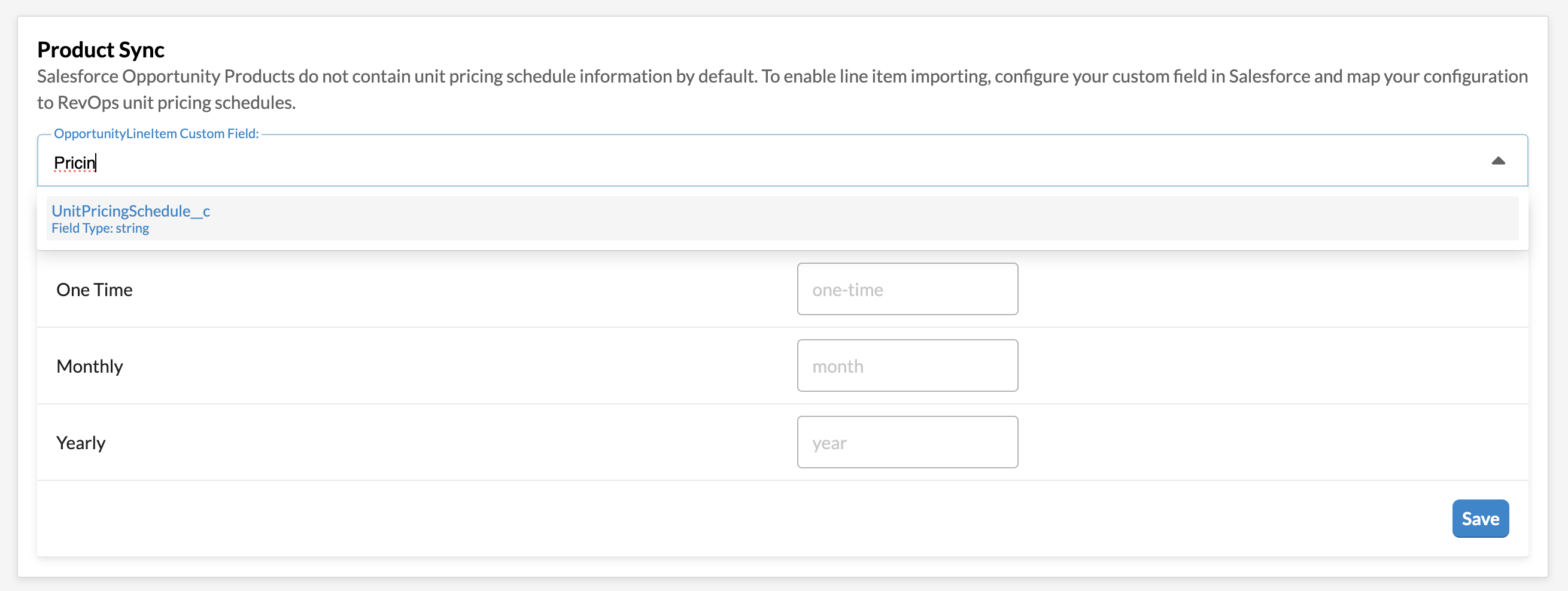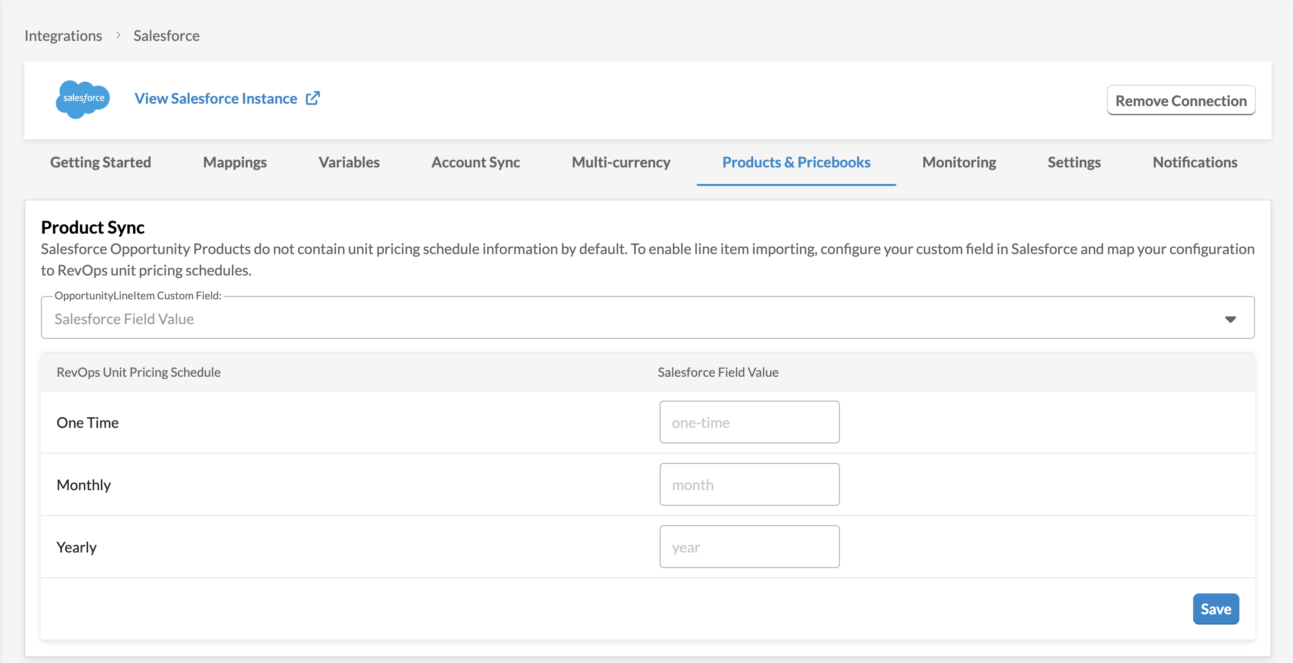 After adding the custom fields in Salesforce, configure your import settings in RevOps. If you go to your Salesforce Integration settings page and don't see a "Products & Pricebooks" tab, you will need to reach out to your account manager or support@revops.io to enable the feature for your Workspace.