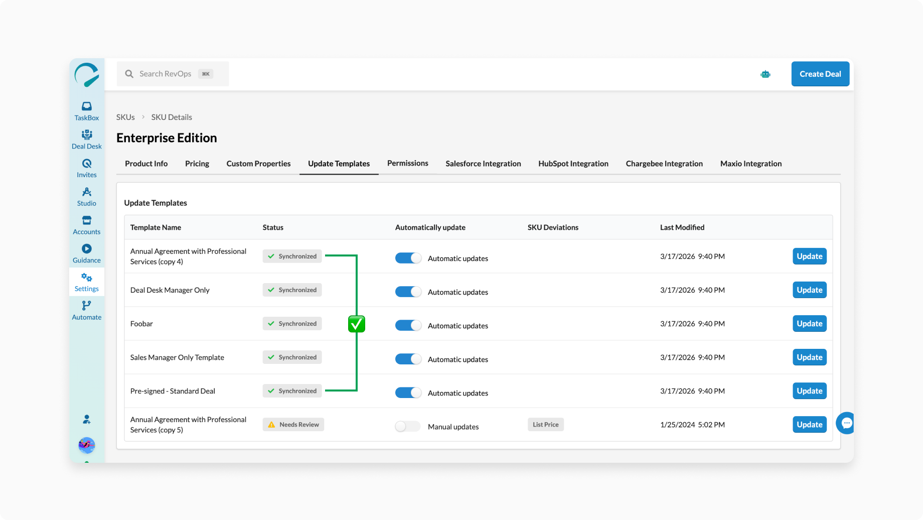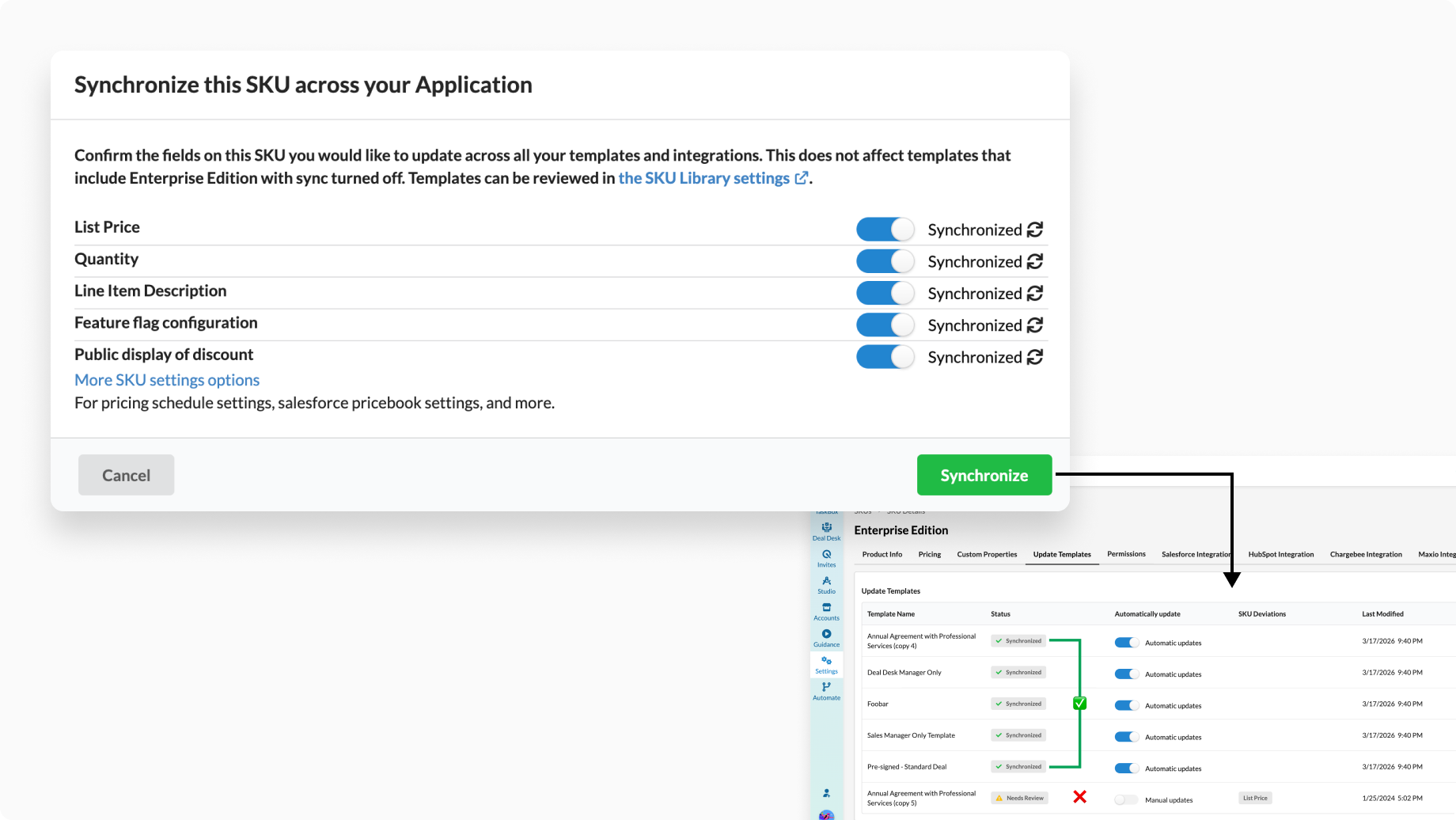 SKU synchronization keeps your SKU data consistent across your deals by automatically applying updates to templates where the SKU is used.