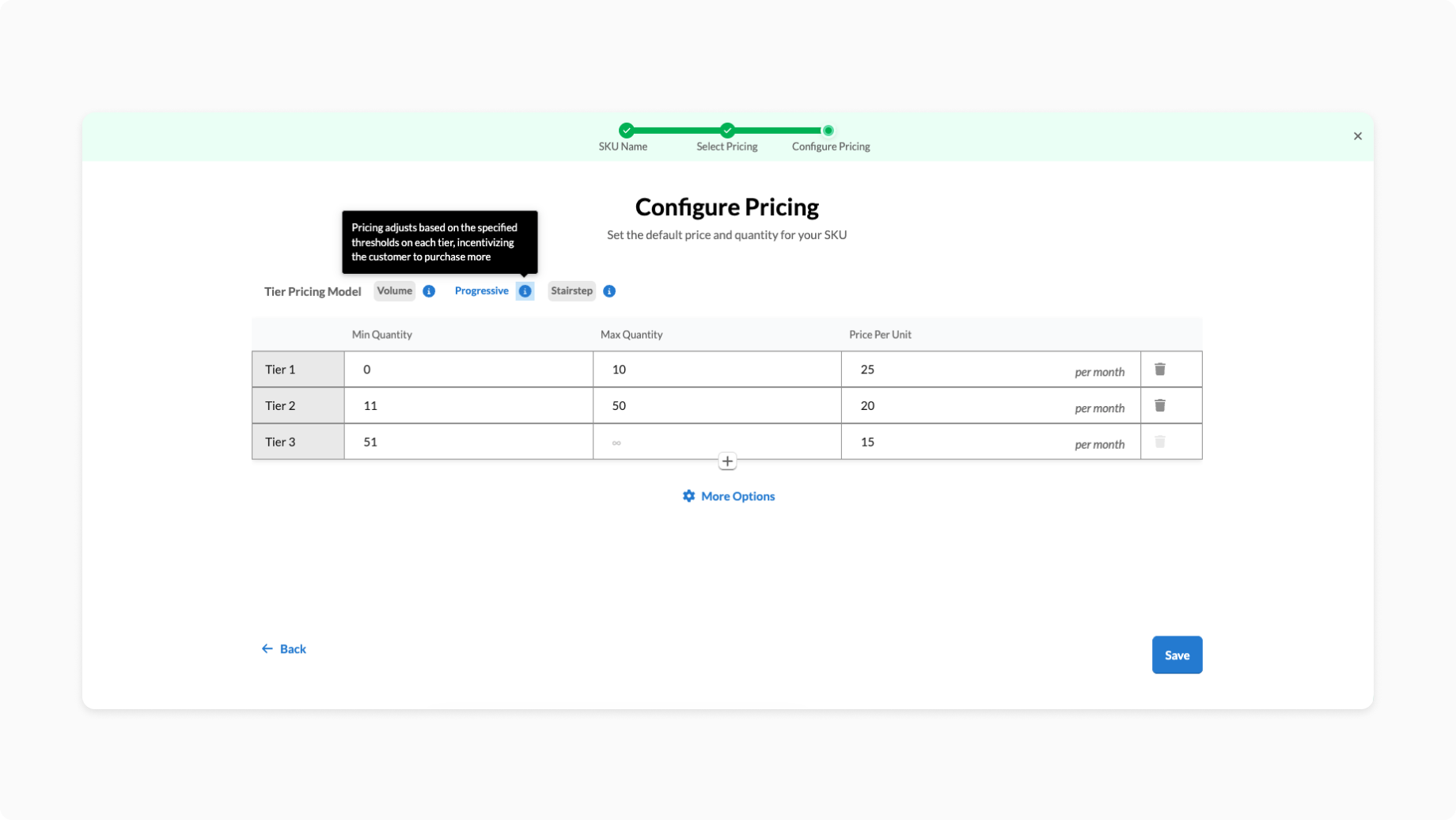 In this step, select the Progressive Tier Pricing Model. You will be presented with a table where you can define the minimum and maximum quantity, and price per unit. You can add as many tiers as you need and can always edit the tiers later.
