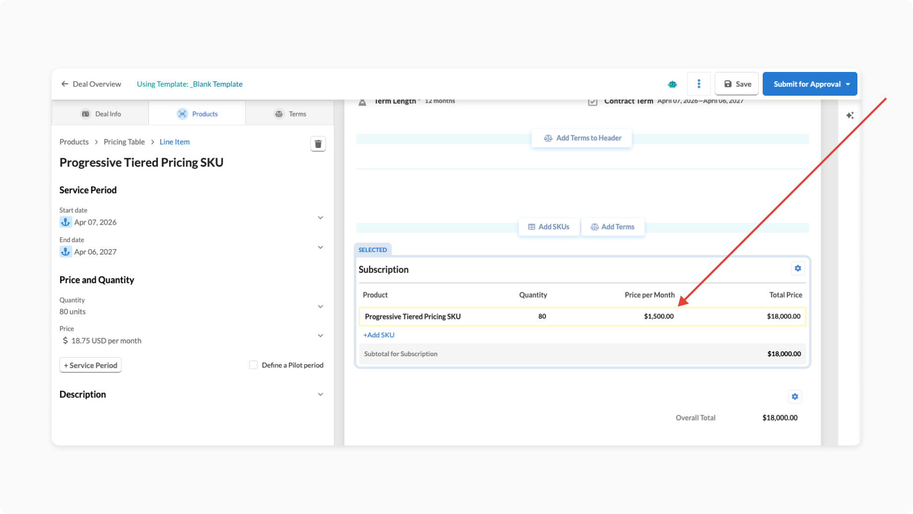 To start quoting, click on "Create new Deal". On the deal, click the Add SKUs button to create a new line item with your progressive tiered pricing product. Click the Done button to create a pricing table, titled "Subscription" by default, with your SKU as a line item. To learn more about how to adjust the display of this table, take a look at this article.