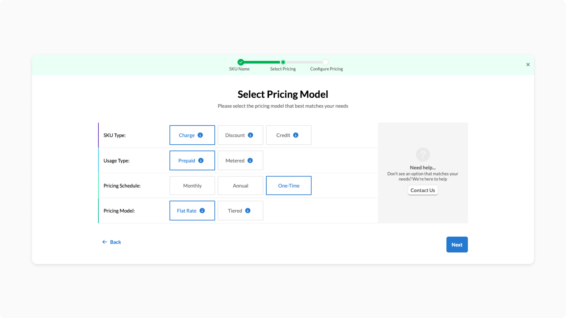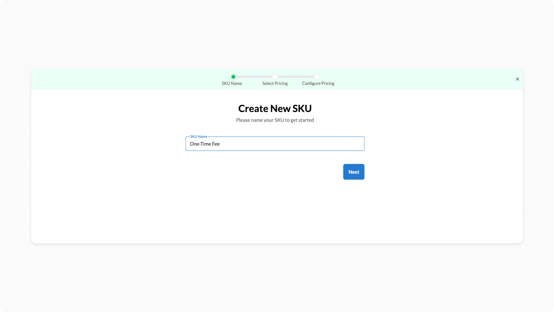 To create a One-time priced SKU, you need to start by going to the SKUs settings page (Hover on Settings, click the 1st item in the list, SKUs). Once there, create a new SKU using the + Create SKU button.