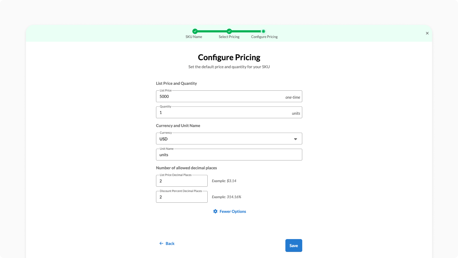 Once SKU is created you will be redirected to the SKU Detail/Edit page where you can review all provided information or continue editing fields not surfaced in the creation wizard. Continue filling in all relevant information for your SKU. SKU Name will be used only within RevOps while the Line Item Title will be made visible to your customer. Include any specifying language in the Description field, like types of services to be rendered or terms of support services.