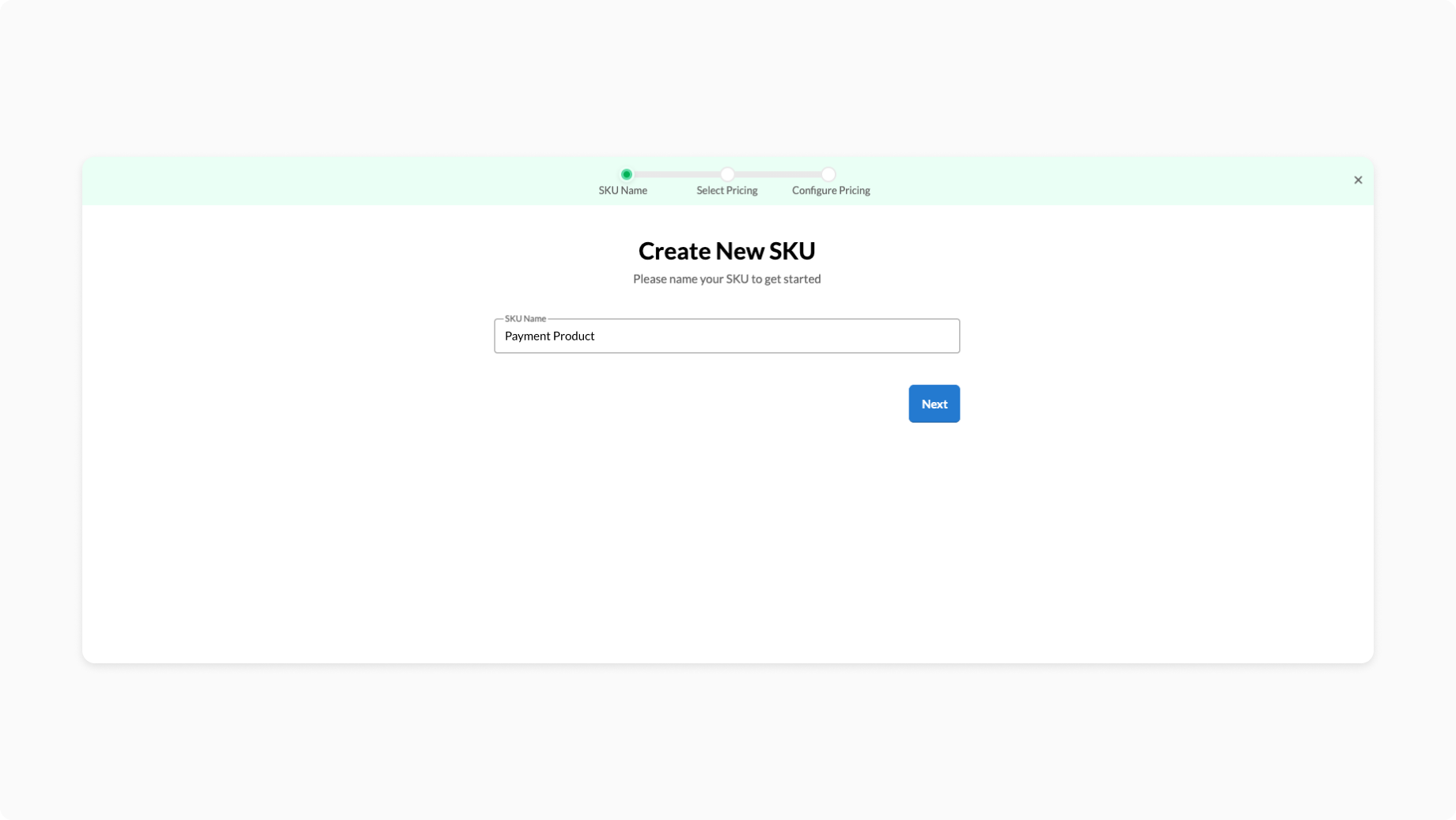 To create a Per-feature priced SKU, you need to start by going to the SKUs settings page (Hover on Settings, click the 1st item in the list, SKUs). Once there, create a new SKU using the Create SKU button. In the SKU creation wizard first define a SKU name. We will use Payments Product in our example.