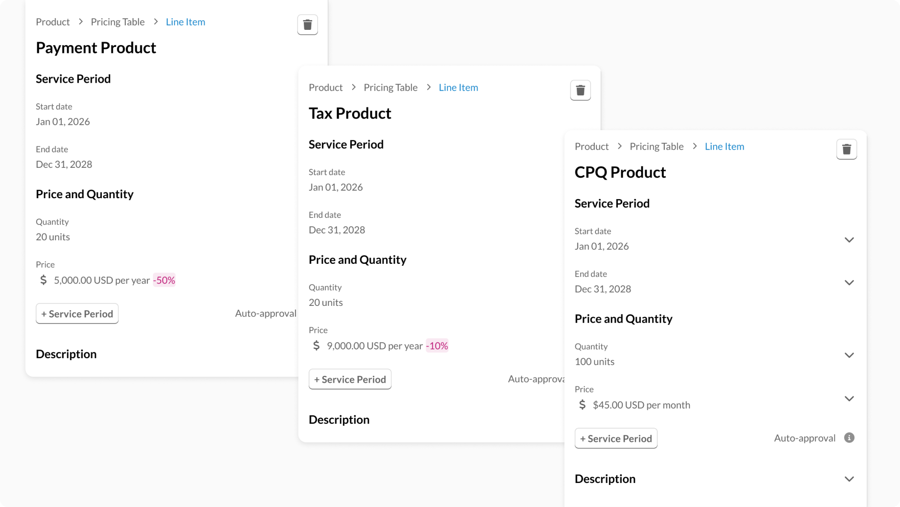 After creating the Payments product SKU, create Tax and CPQ product SKUs so you can offer them together or separately to your customers.