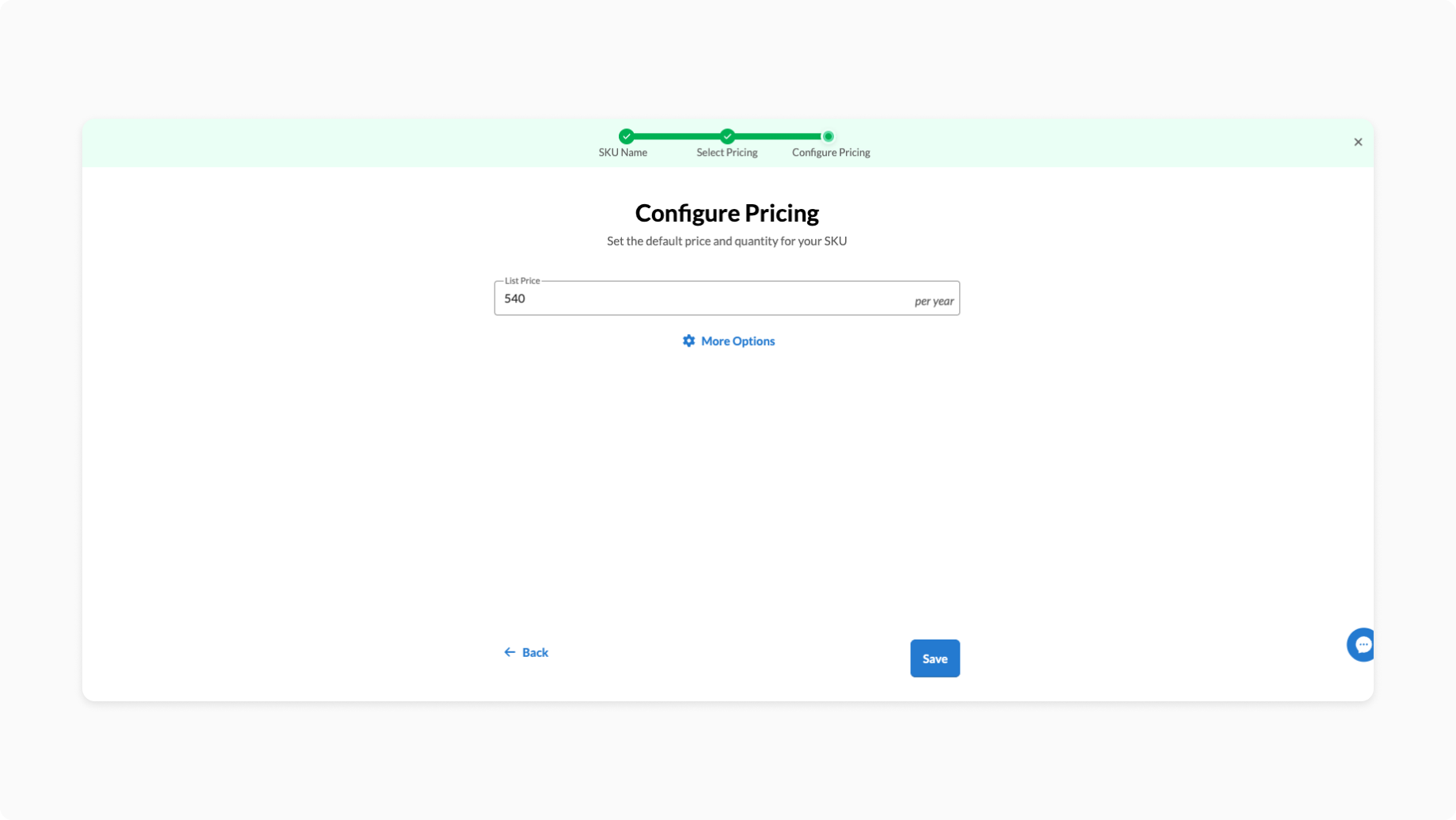 To create a Per-user priced SKU, you need to start by going to the SKUs settings page (Hover on Settings, click the 1st item in the list, SKUs). Once there, create a new SKU using the Create SKU button. In the SKU creation wizard first define a SKU name.