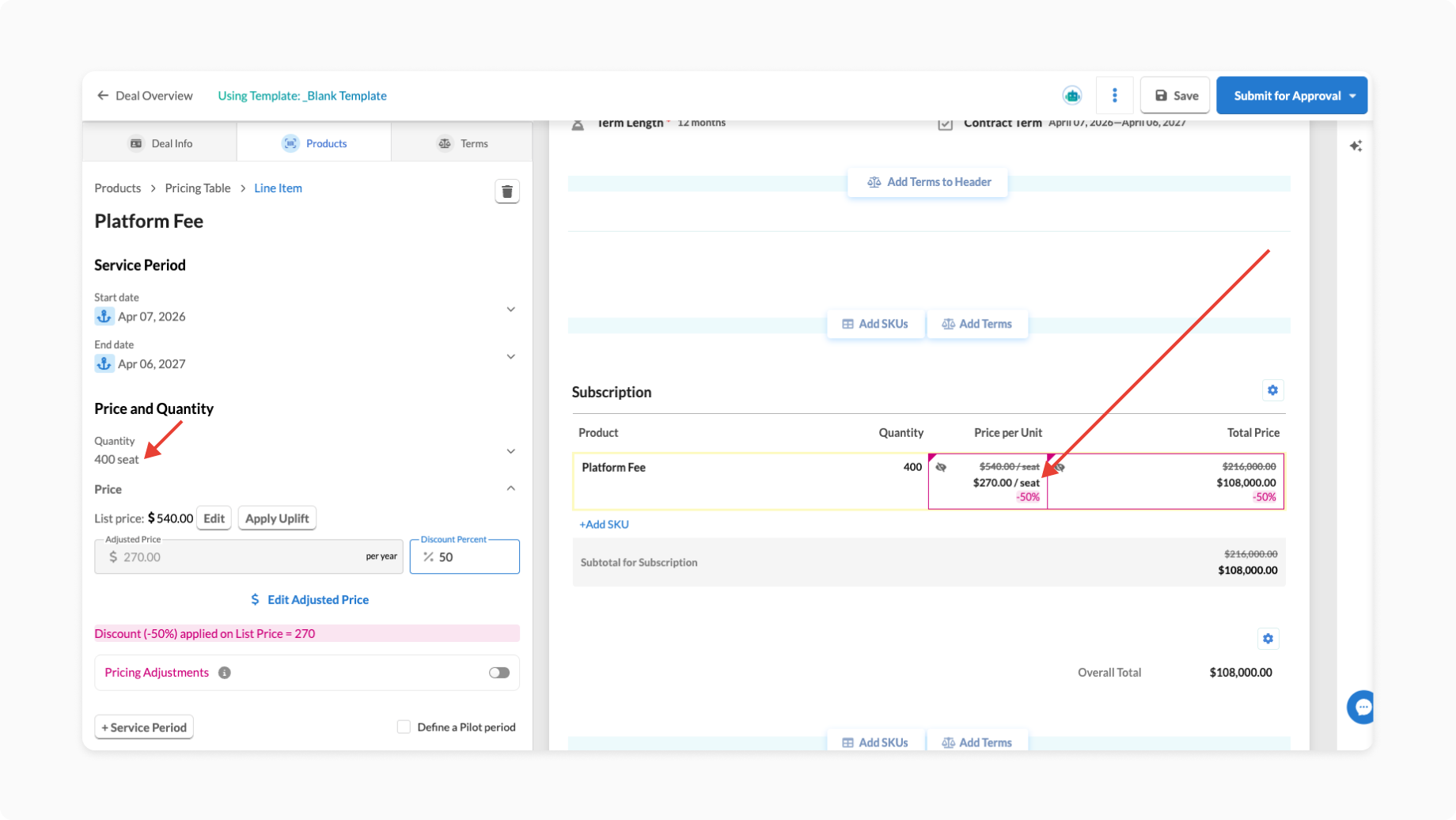 The yearly Platform Fee SKU has a 50% discount applied.