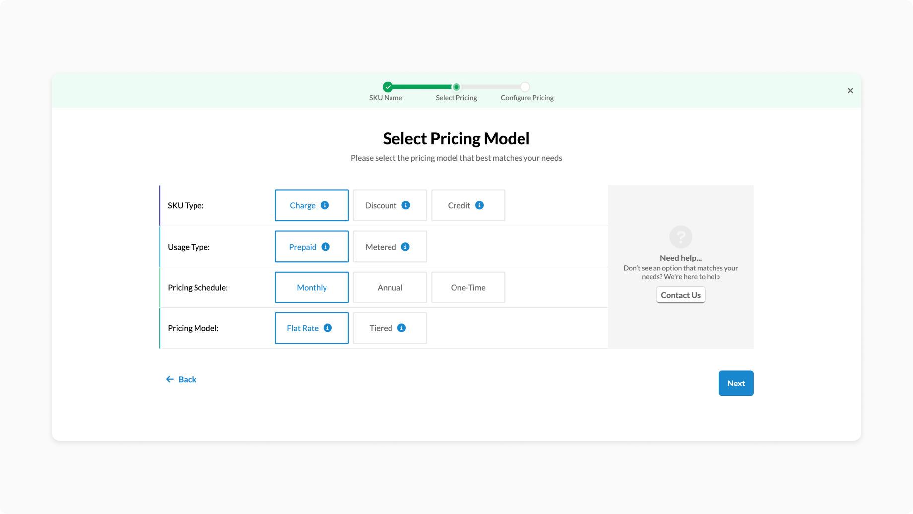 - Pricing Model: Flat Rate or Tiered (both options support Scheduled SKUs).