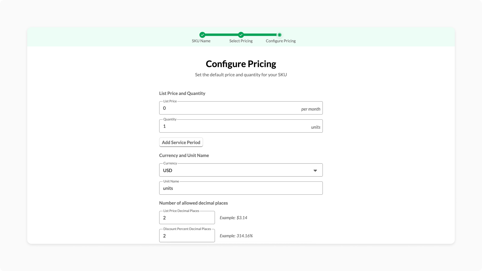 - List price - Use this text box to define the default list price of one unit of the SKU either per-month or per-year . For flexibility, each pricing period can have a different subscription interval.
