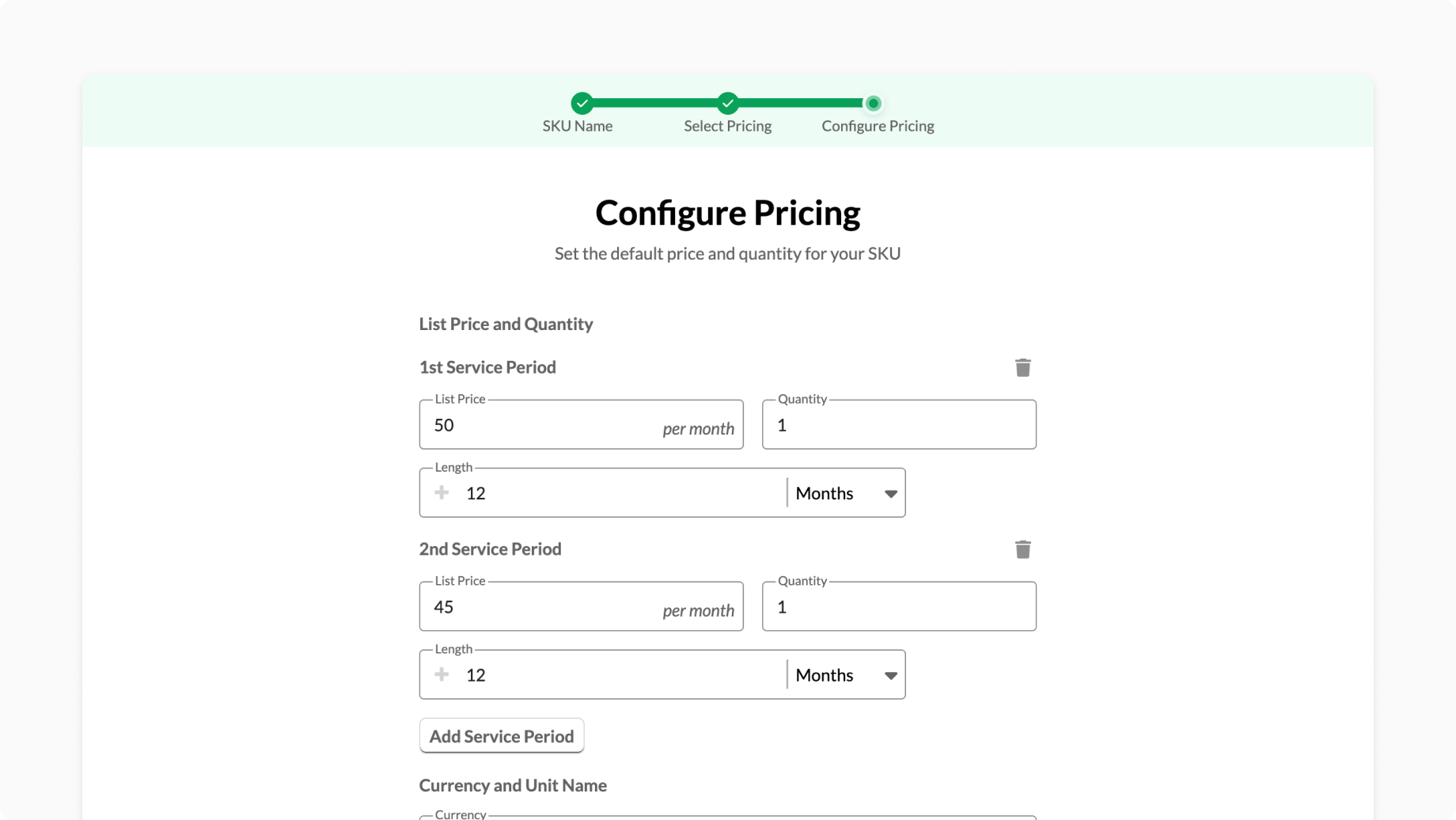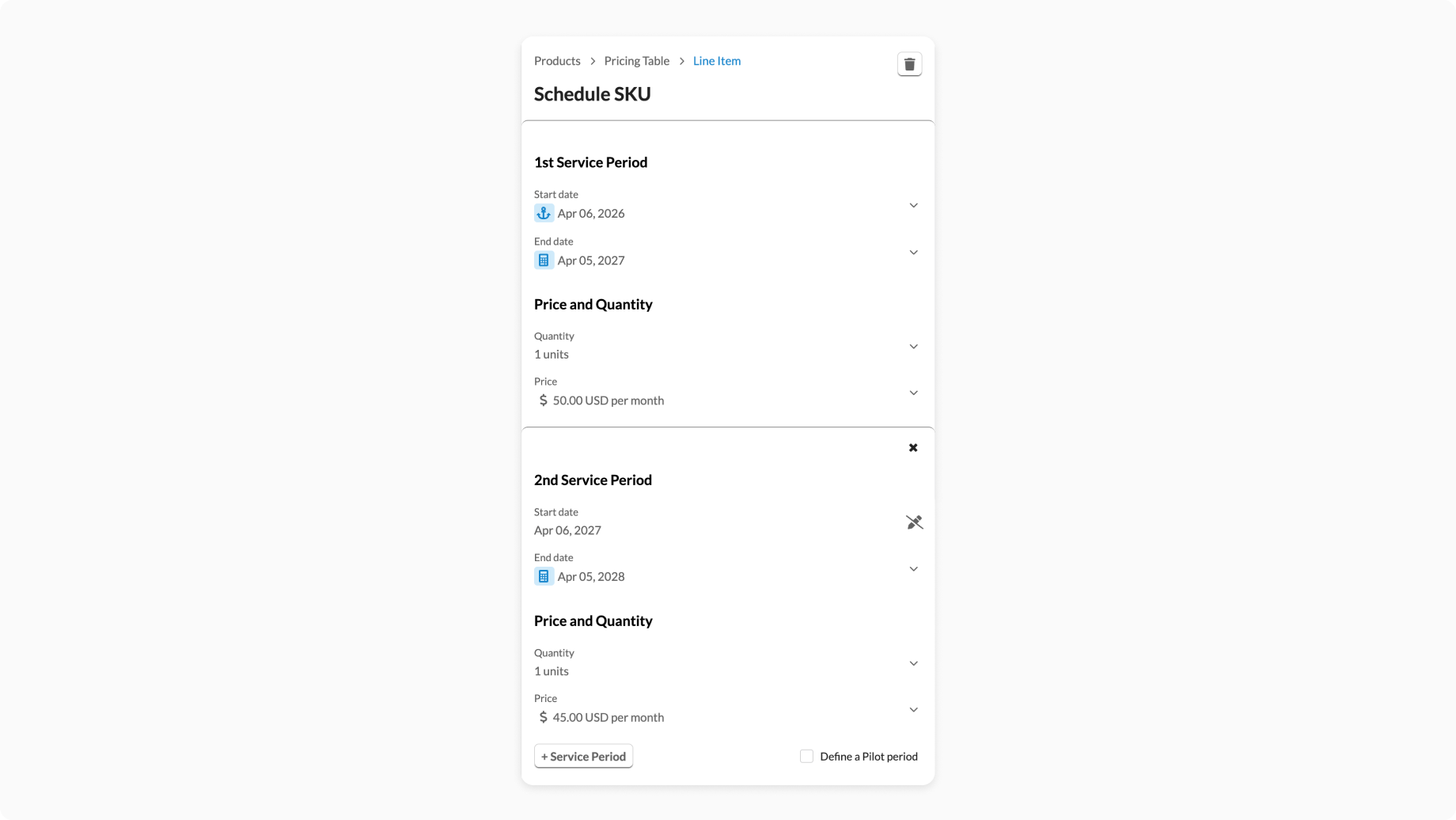 - Add another Service period - Use this button to add another Pricing Period and ramp the SKU’s pricing.