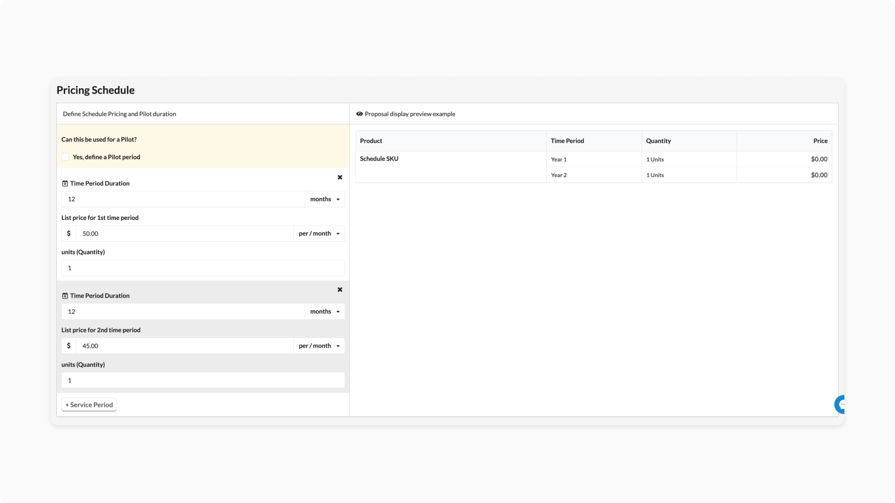 - Can this be used for a Pilot? Check the Yes, defined a Pilot period checkbox to add a Pilot Pricing Period to the beginning of the Pricing Schedule. This Pricing Period is the same as all other Pricing Periods expect for the special display indicating that it’s a “pilot” period.
